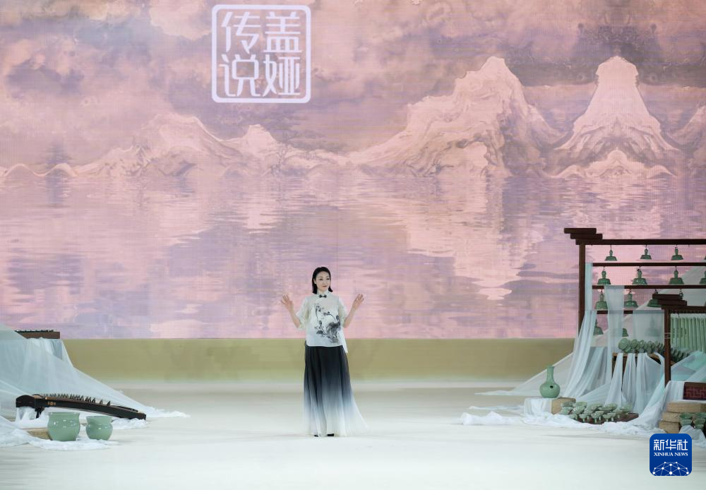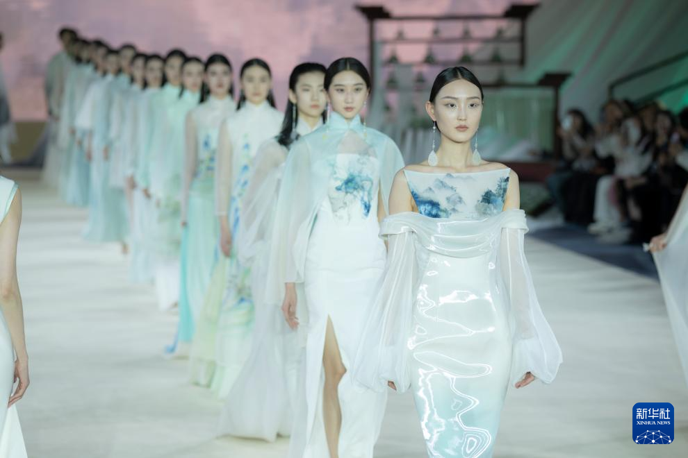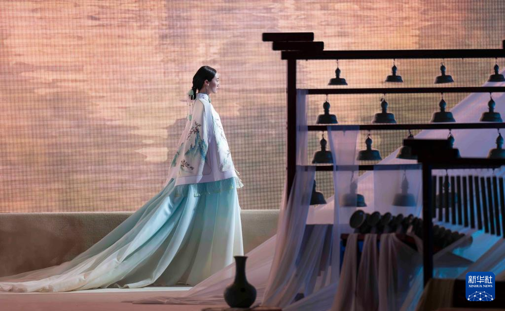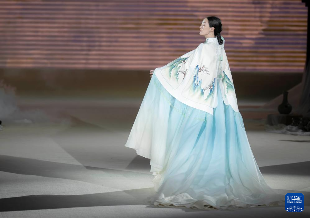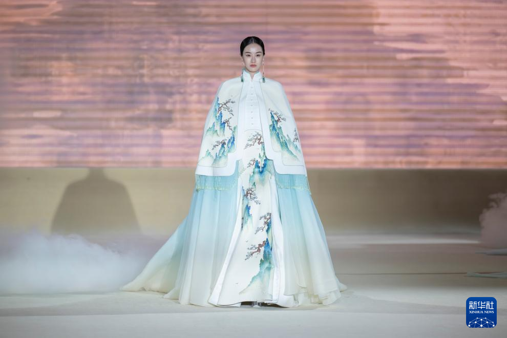 3月18日,在熊英·盖娅传说“华夏·碧华”2024秋冬品牌发布会上,模特展示时装。(新华社记者 才扬 摄)