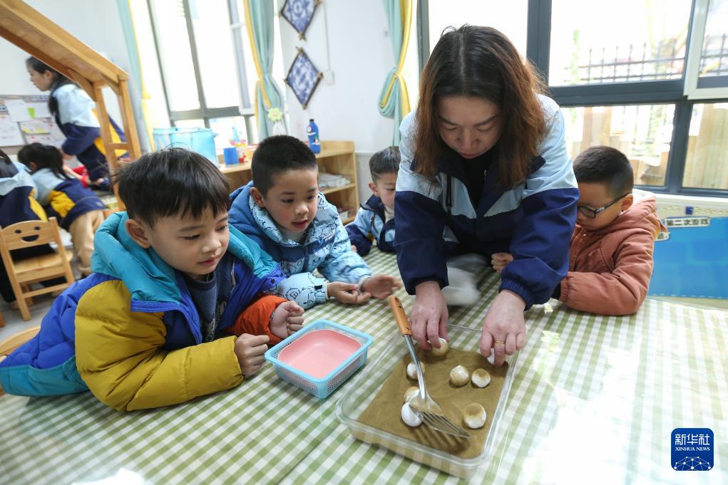 3月19日,贵州省黔南布依族苗族自治州都匀市青云湖幼儿园的老师和小朋友们一起制作汤圆“粘雀嘴”。(新华社发 肖伟 摄)