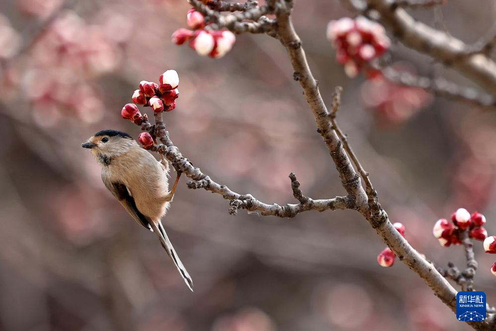 3月16日,在山东省枣庄市东湖公园,一只小鸟在杏花枝头上觅食。(新华社发 孙中喆 摄)
