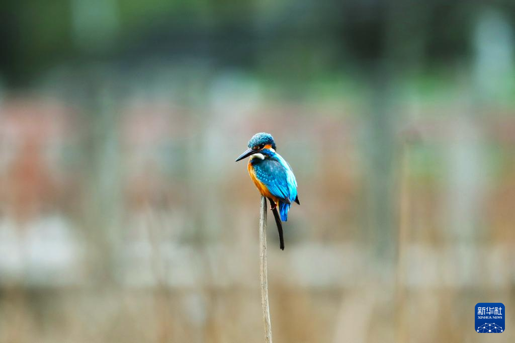 3月17日,四川省达州市通川区,一只翠鸟在荷塘停留。(新华社发 曾猛 摄)