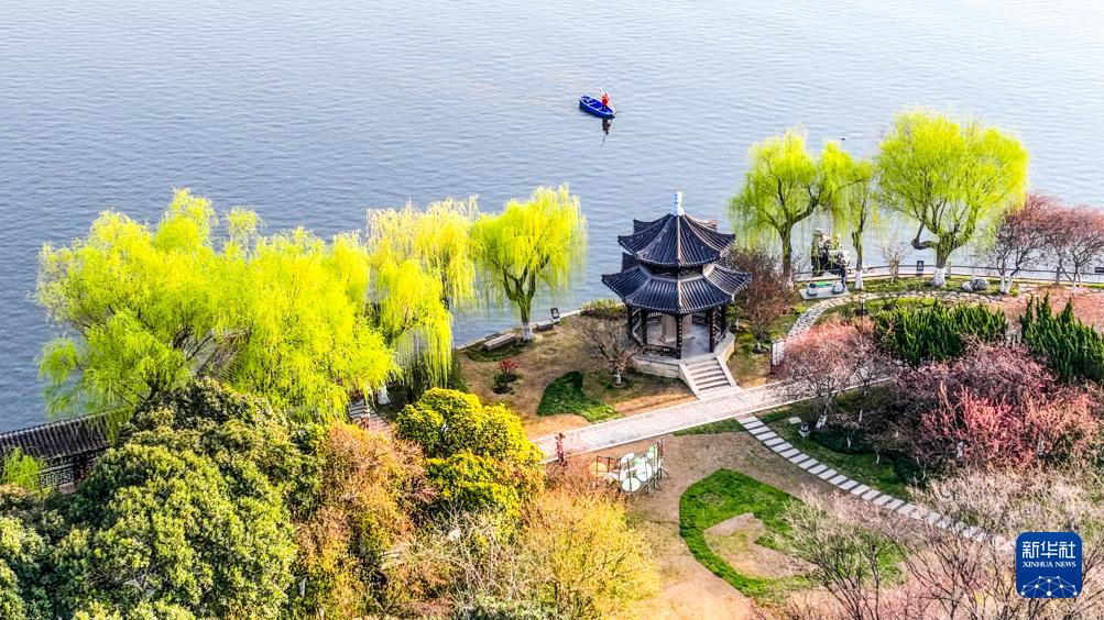 3月19日拍摄的江苏省南京莫愁湖景区春日晨景(无人机照片)。(新华社发 孙忠南 摄)