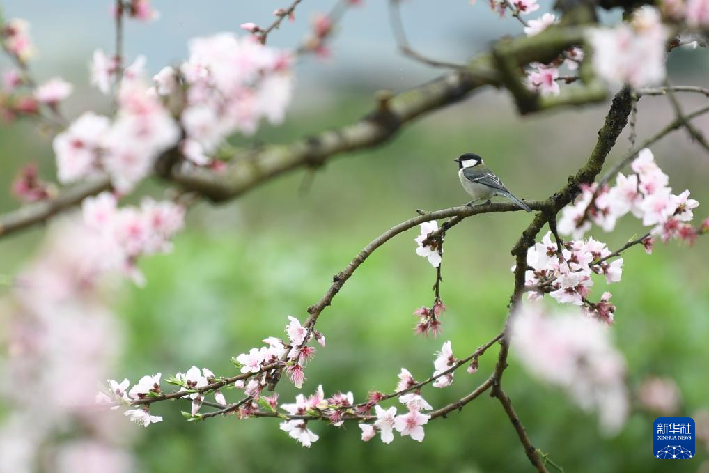 3月20日,小鸟在贵州省遵义市余庆县子营街道上里社区桃花树上停歇。(新华社发 贺春雨 摄)