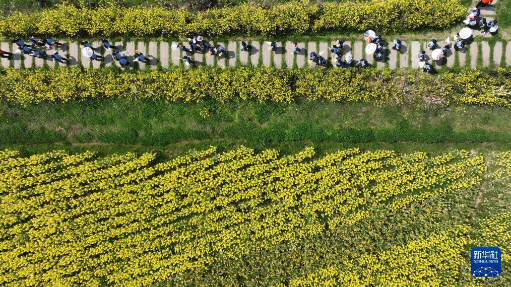 3月21日,教师带领学生在绥阳县盛林生态农场踏青(无人机照片)。(新华社记者 杨楹 摄)