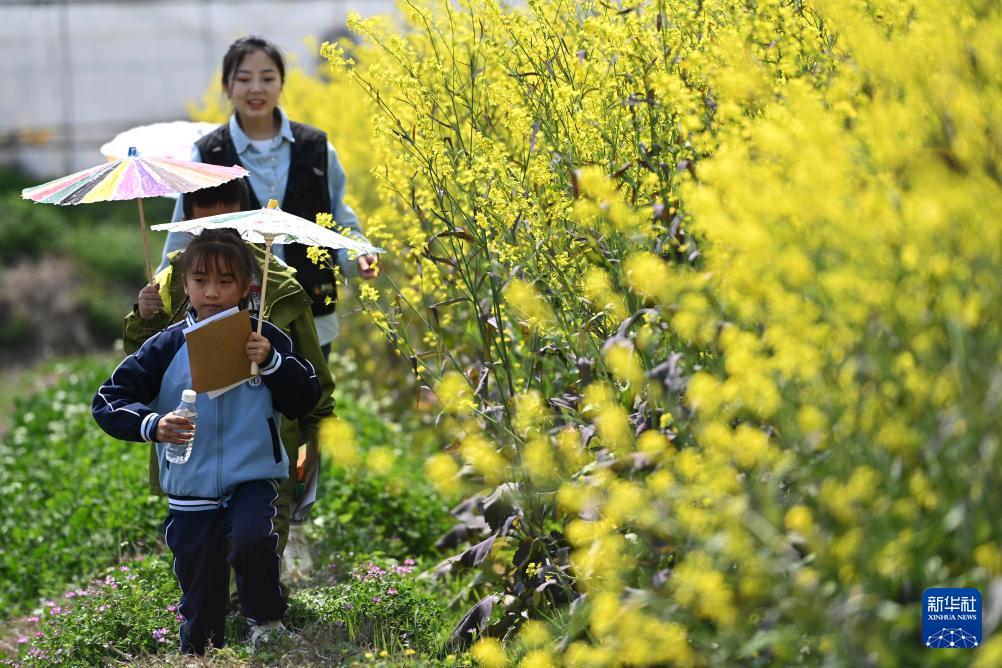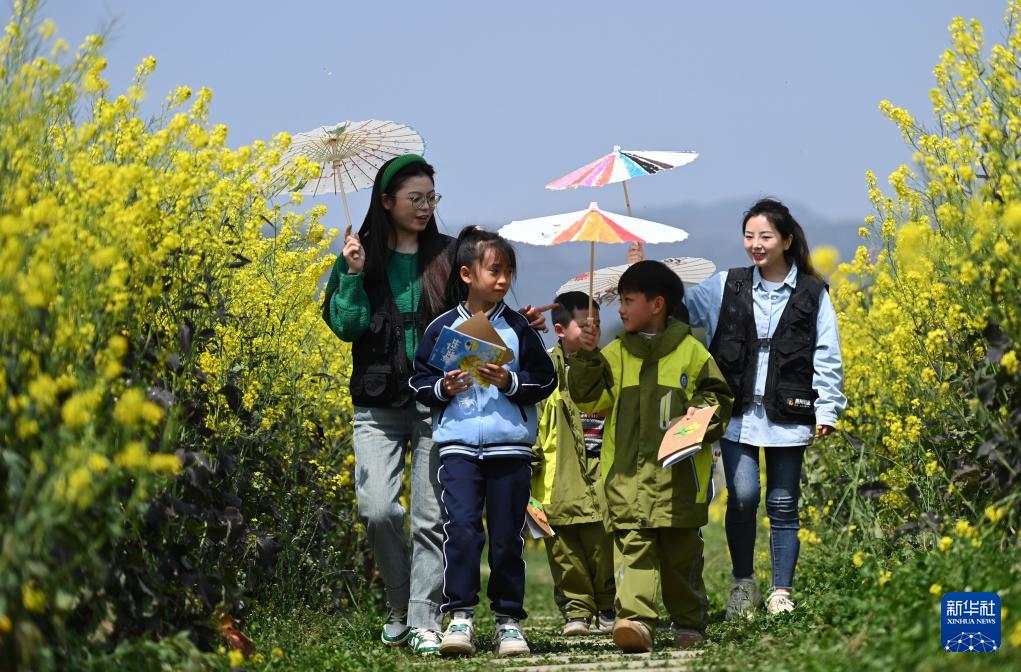 3月21日,教师带领学生在绥阳县盛林生态农场踏青。(新华社记者 杨楹 摄)