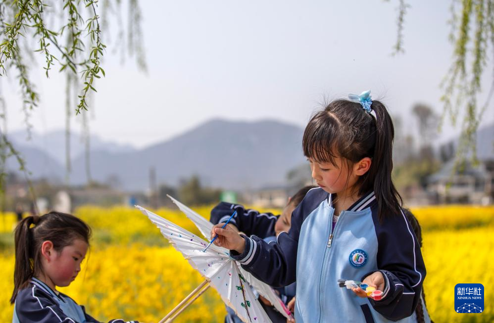 3月21日,学生在绥阳县盛林生态农场制作手工作品。(新华社发 李珊珊 摄)