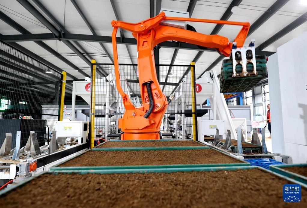 3月25日,在浙江省湖州市德清县洛舍镇东衡村先丰农业智能育秧工厂内,机器人在搬运育秧盘。(新华社发 谢尚国 摄)