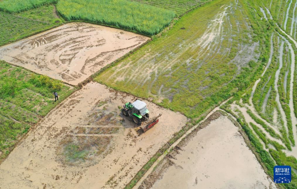 3月25日,在湖南省永州市道县白马渡镇樟武坊村,村民在翻耕早稻育秧田(无人机照片)。(新华社发 何红福 摄)