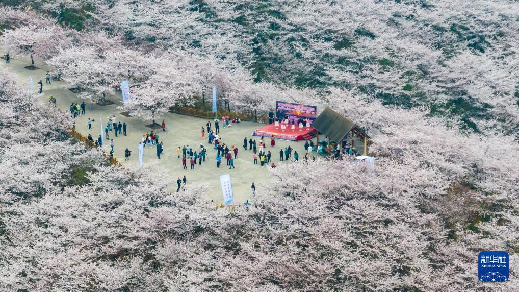 3月26日,游人在贵州省安顺市西秀区黄腊布依族苗族乡樱花园赏花游玩(无人机照片)。(新华社发 陈熙 摄)