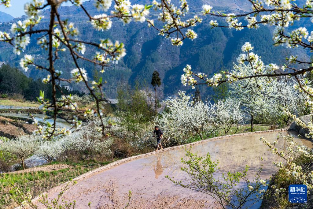 3月25日,在重庆市南川区金山镇院星村,村民在绽放的李花中劳作。(新华社发 瞿明斌 摄)