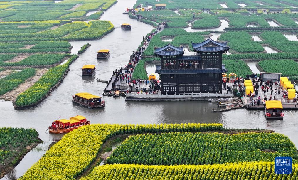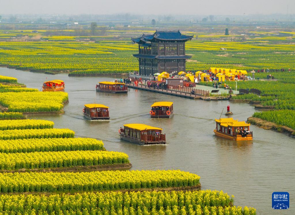 3月26日,游人在江苏省兴化市千垛菜花景区乘船游览(无人机照片)。(新华社发 孟德龙 摄)