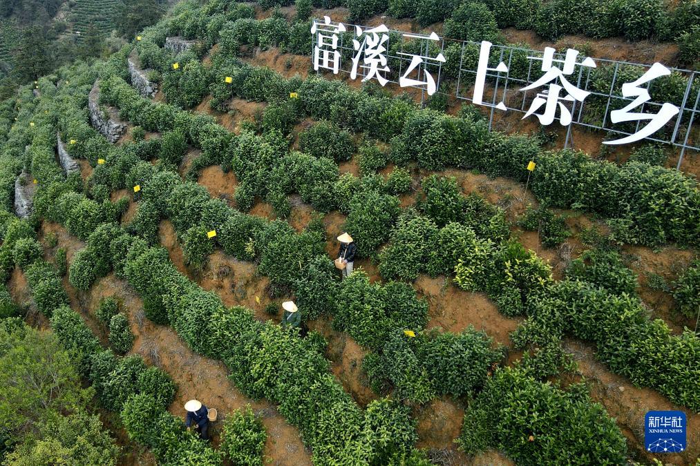 3月28日,在安徽省黄山市徽州区富溪乡,茶农在采摘黄山毛峰鲜叶(无人机照片)。(新华社记者 黄博涵 摄)