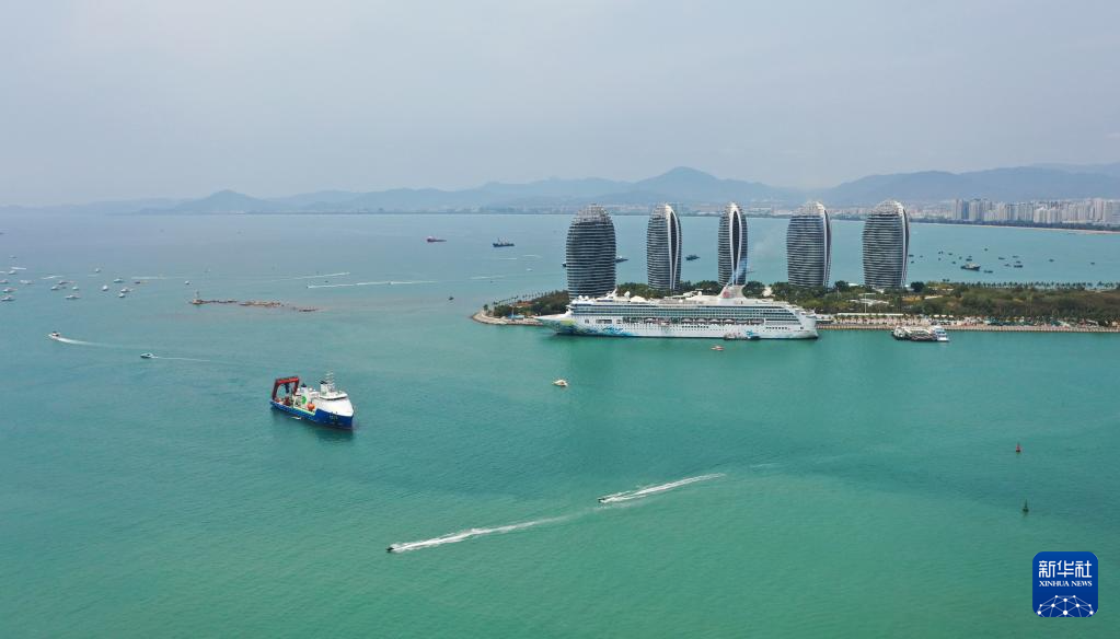 3月28日,“探索一号”科考船缓缓驶入三亚港(无人机照片)。(新华社发 沙晓峰 摄)