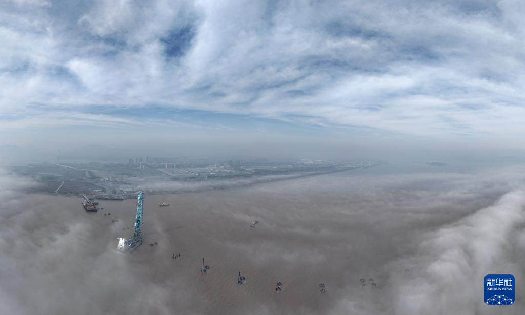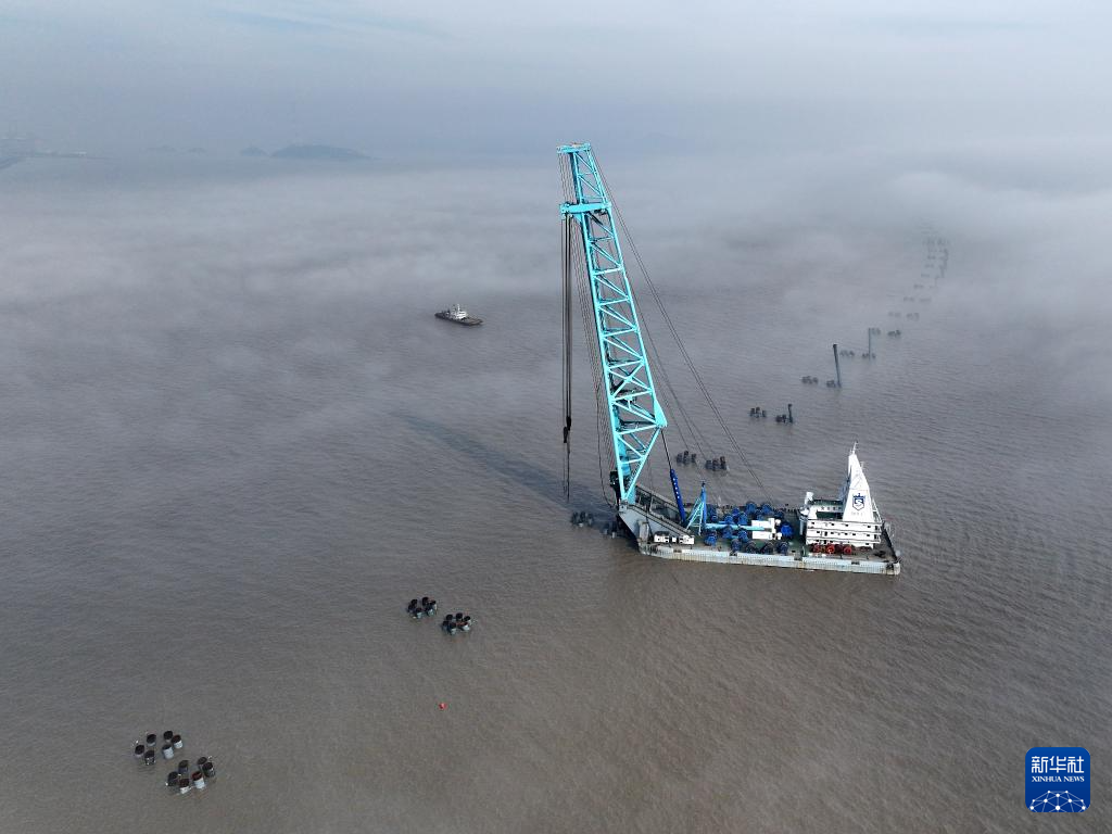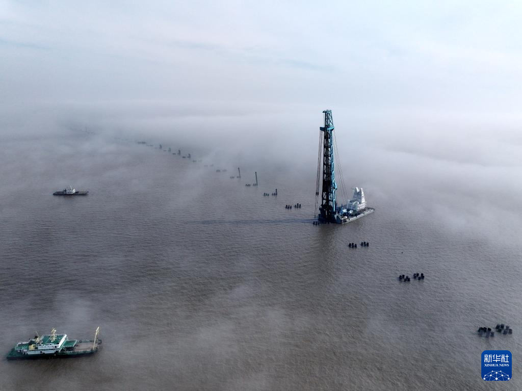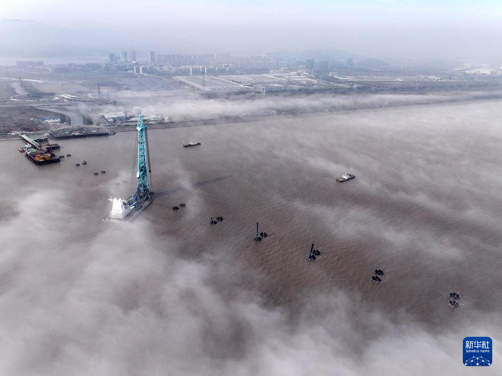 4月1日,浙江省舟山市青龙门水域薄雾飘渺,由550根钢管桩串连而成的青龙门特大桥西引桥水下桩基群似巨龙出水,若隐若现,蔚为壮观。