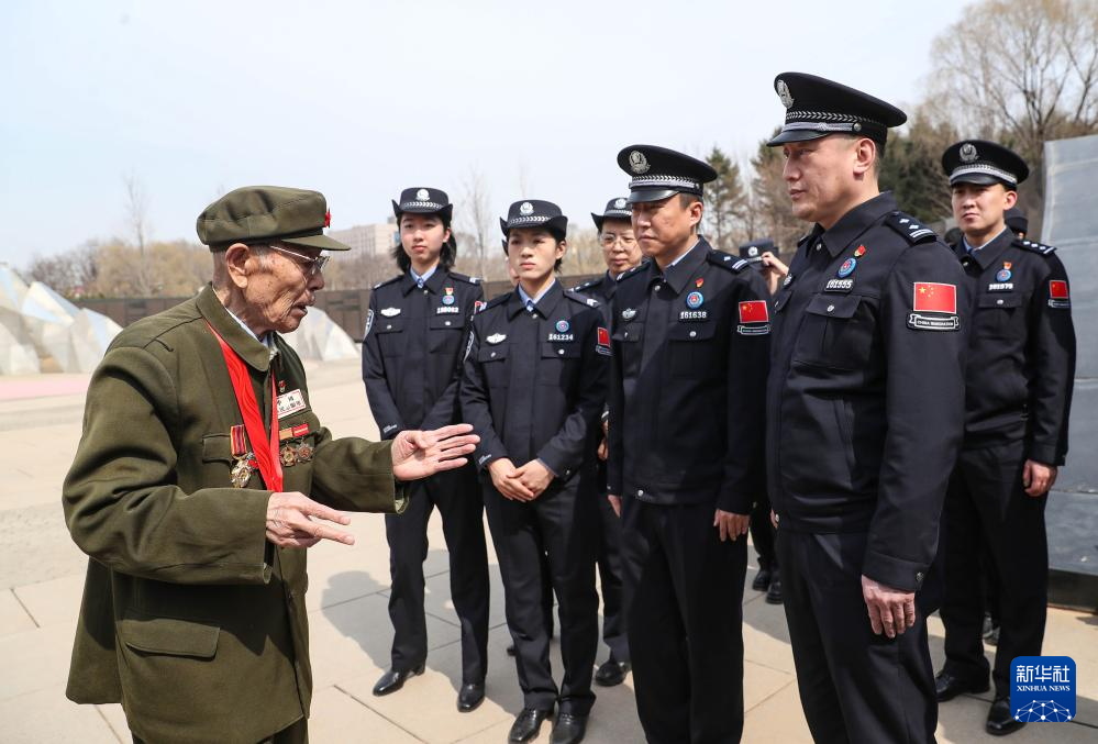 4月2日,在沈阳抗美援朝烈士陵园,志愿军老战士金东辉(左一)为沈阳出入境边防检查站民警讲述战斗故事。(新华社记者 龙雷 摄)