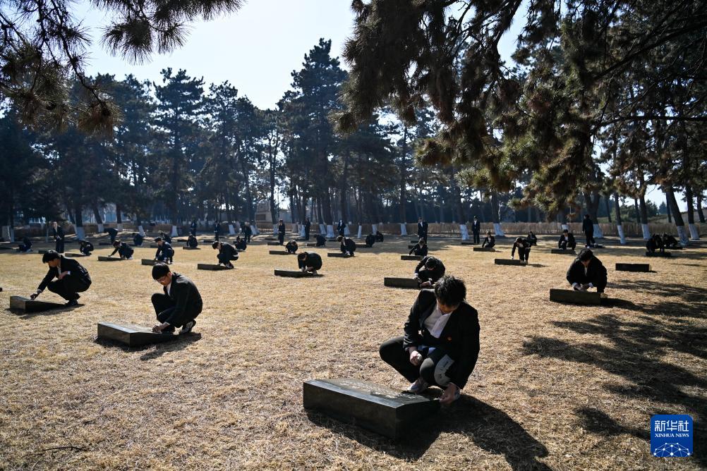 4月2日,在沈阳抗美援朝烈士陵园,沈阳出入境边防检查站民警擦拭烈士墓碑。(新华社记者 龙雷 摄)