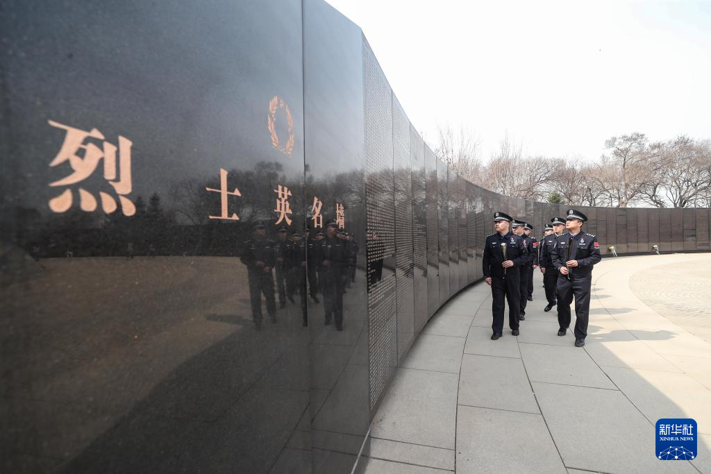 4月2日,在沈阳抗美援朝烈士陵园,沈阳出入境边防检查站民警瞻仰烈士英名墙。(新华社记者 龙雷 摄)