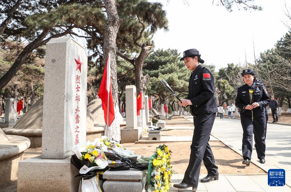 4月2日,在沈阳抗美援朝烈士陵园,沈阳出入境边防检查站民警在烈士墓碑前献花。(新华社记者 龙雷 摄)