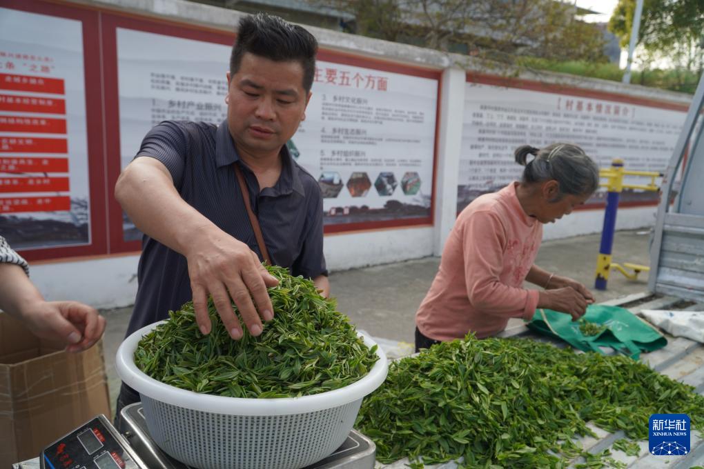4月2日,茶商在贵州省石阡县龙井仡佬族侗族乡枫香坪村收购茶青。(新华社记者 姜贺轩 摄)