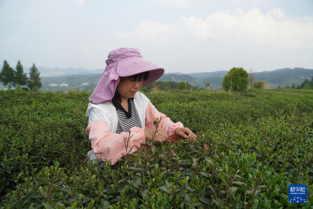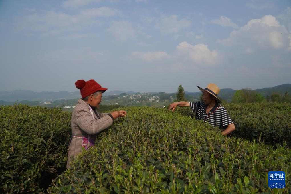 4月2日,茶农在贵州省石阡县龙井仡佬族侗族乡枫香坪村采茶。(新华社记者 姜贺轩 摄)