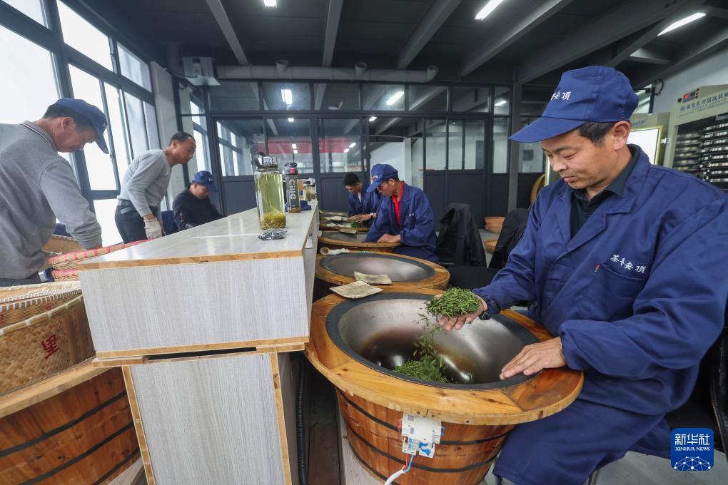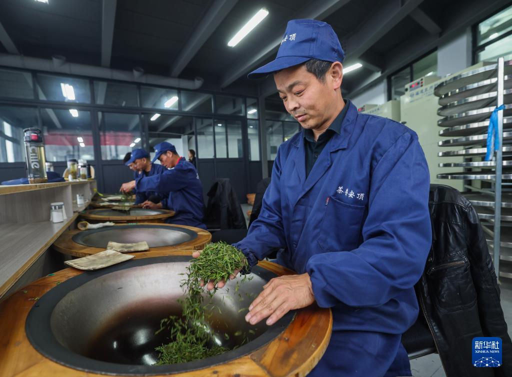 4月8日,在里山镇安顶村共富工坊内,茶农在手工炒制安顶云雾茶。(新华社记者 徐昱 摄)