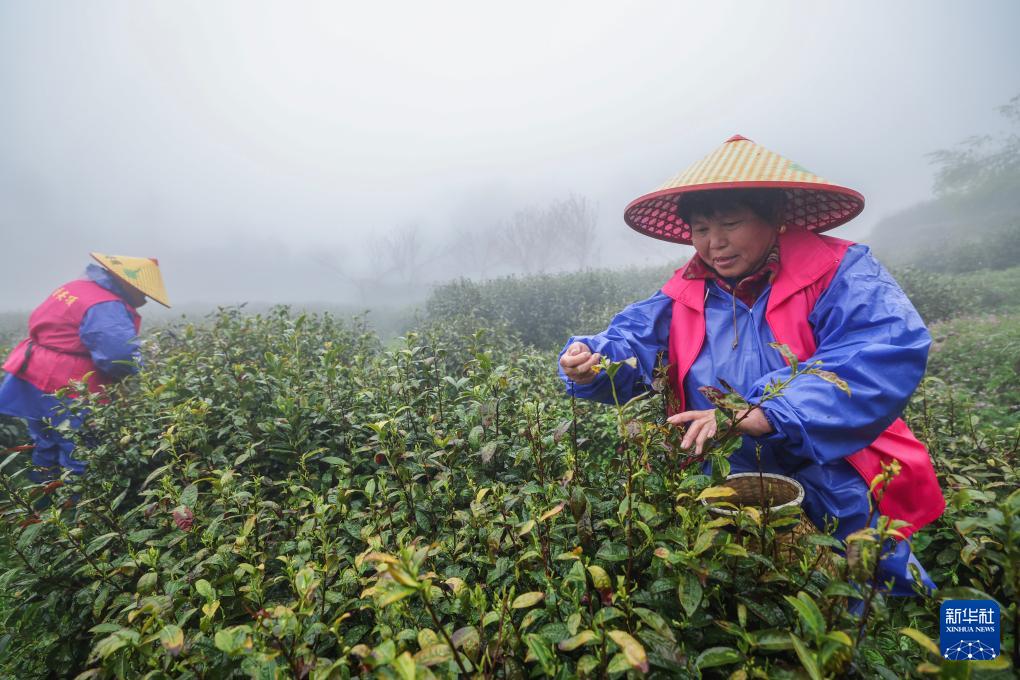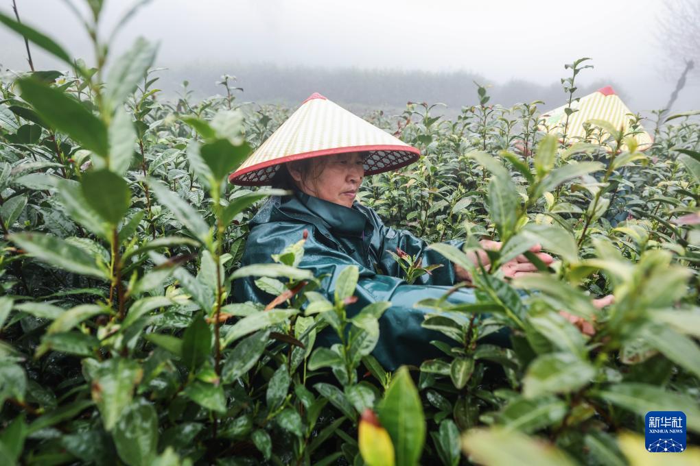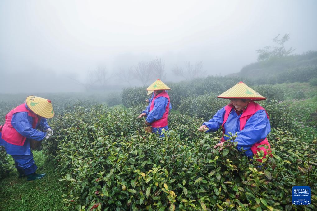 4月8日,在里山镇安顶村的安顶云雾茶种植基地内,茶农在采摘云雾茶。(新华社记者 徐昱 摄)