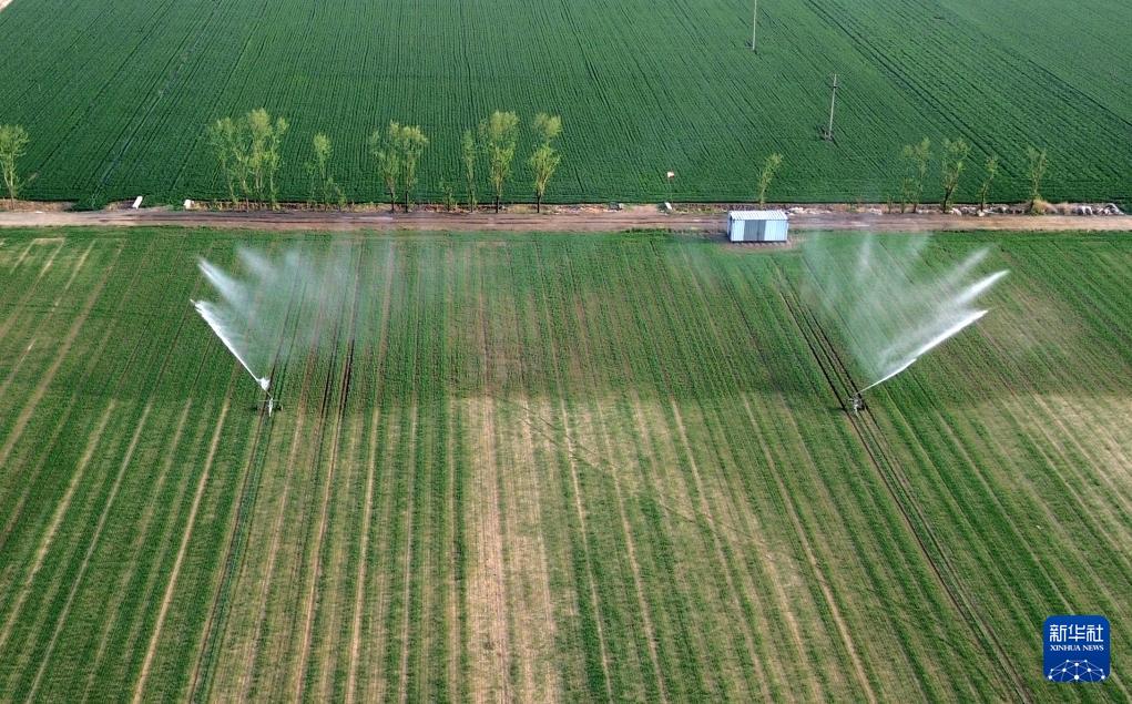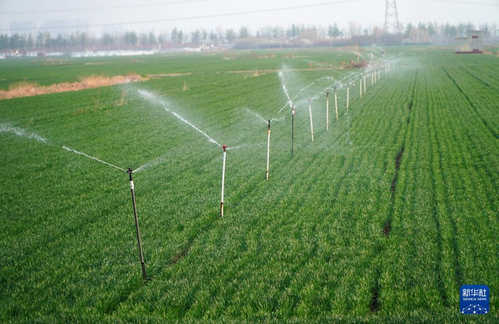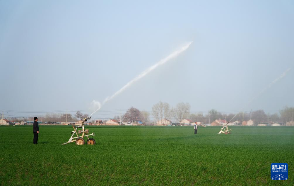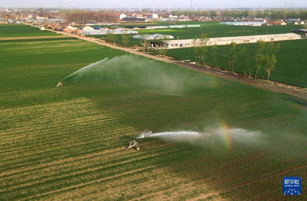 4月8日,在山东省潍坊市寒亭区高里街道,农业灌溉设备在为小麦浇水。(新华社记者 徐速绘 摄)