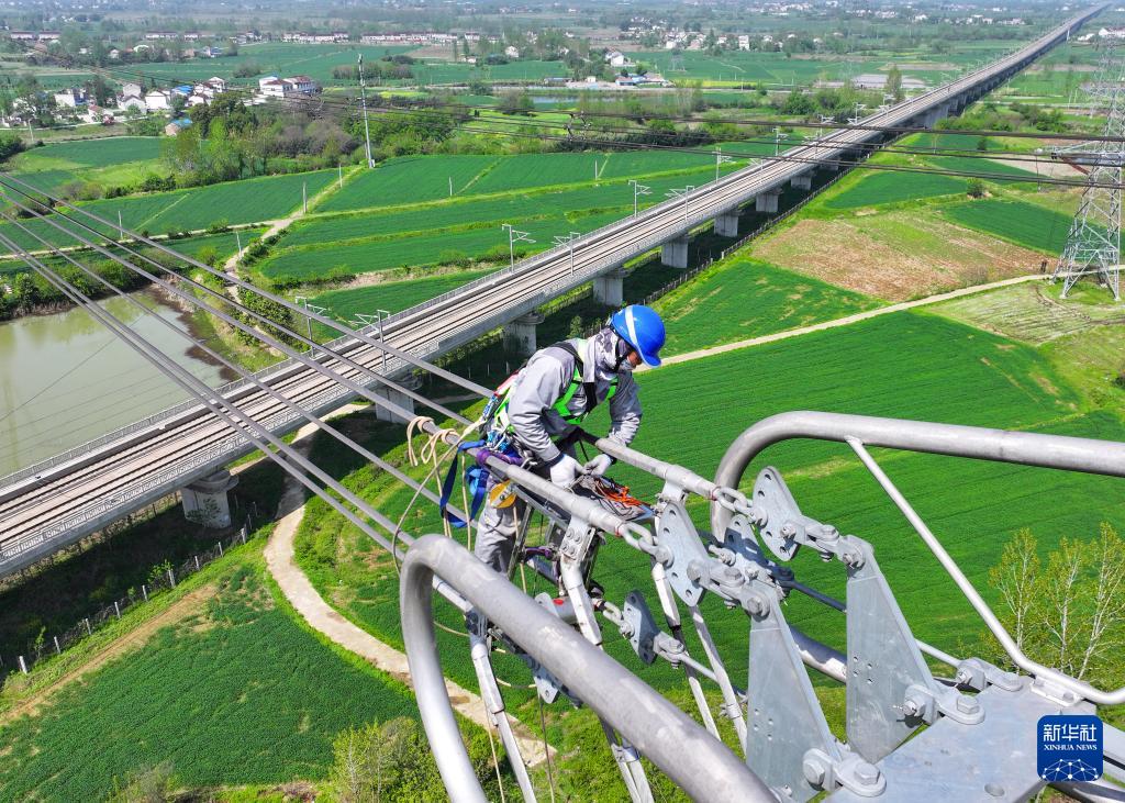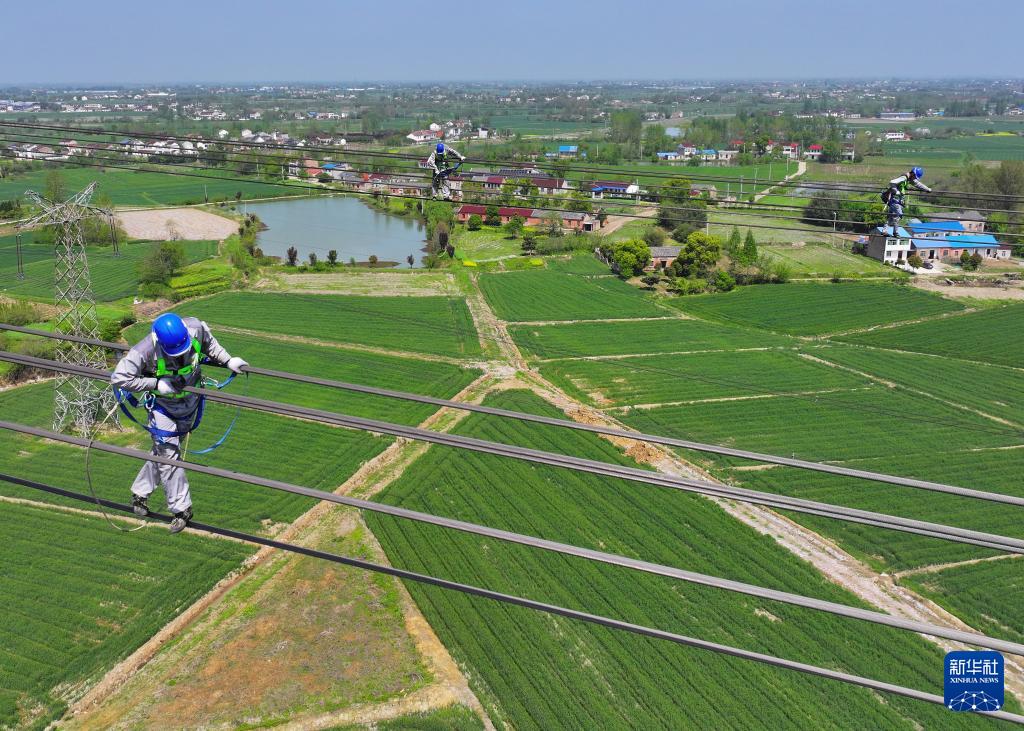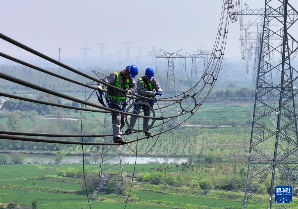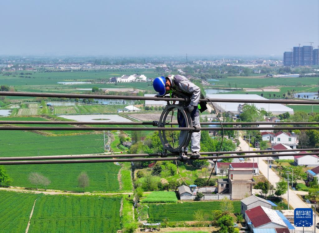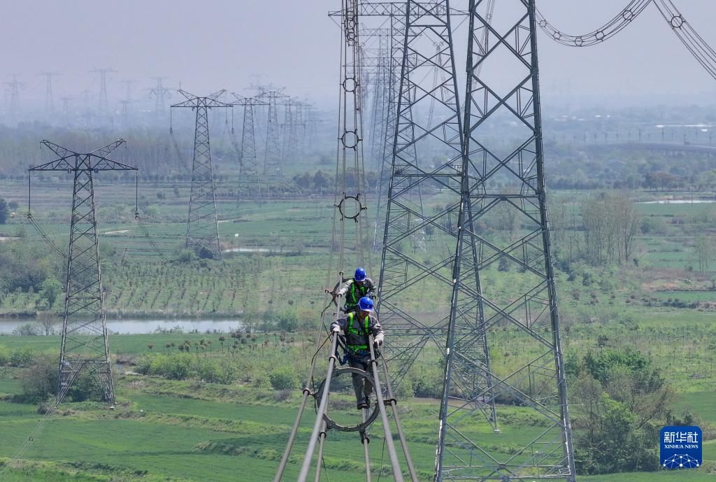 4月9日,在位于安徽省合肥市庐江县郭河镇的直流±800千伏建苏线3418号杆塔处,国网合肥供电公司工人进行高空检修作业(无人机照片)。(新华社记者 杜宇 摄)