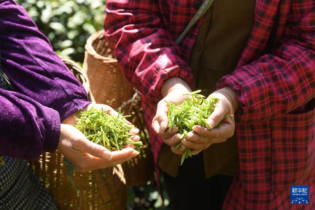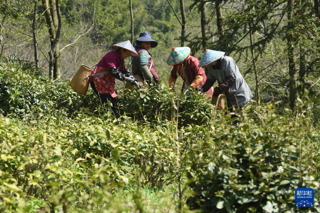 4月9日,采茶工在安吉县天荒坪镇大溪村采摘高山白茶。(新华社记者 翁忻旸 摄)