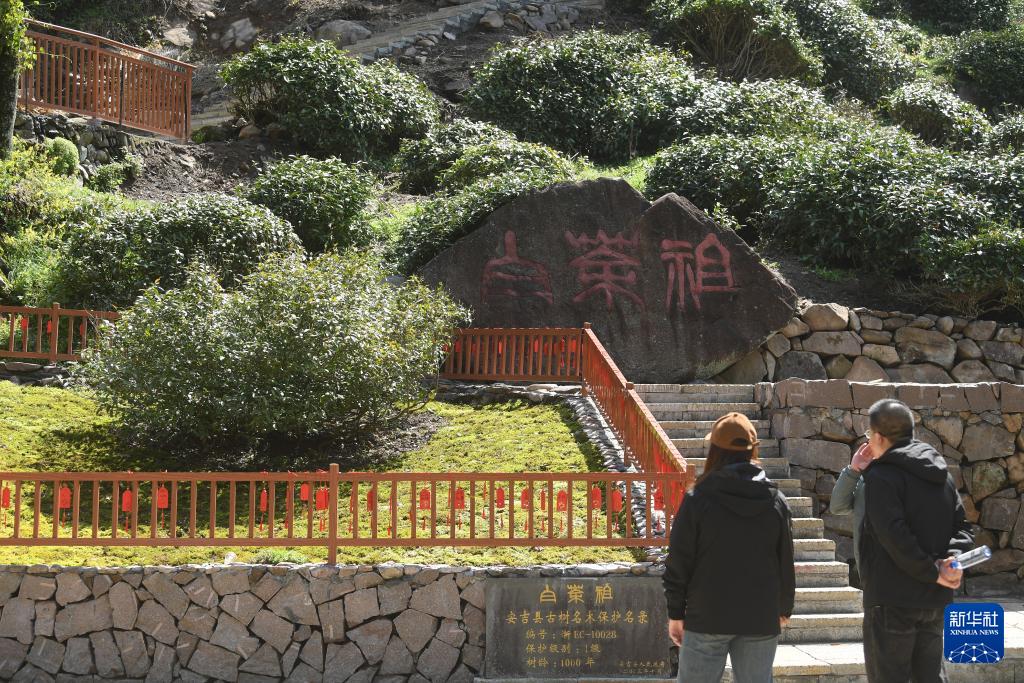 4月9日,在安吉县天荒坪镇大溪村,游客在参观有千年树龄的“白茶祖”母树。(新华社记者 翁忻旸 摄)