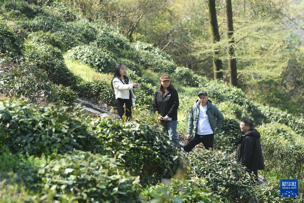 4月9日,在安吉县天荒坪镇大溪村,民宿老板谭诗颖(左一)带着客人在参观茶山。(新华社记者 翁忻旸 摄)