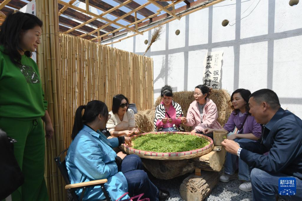 4月9日,在安吉县天荒坪镇余村,游客在一处乡村茶室了解新采摘的白茶。(新华社记者 翁忻旸 摄)