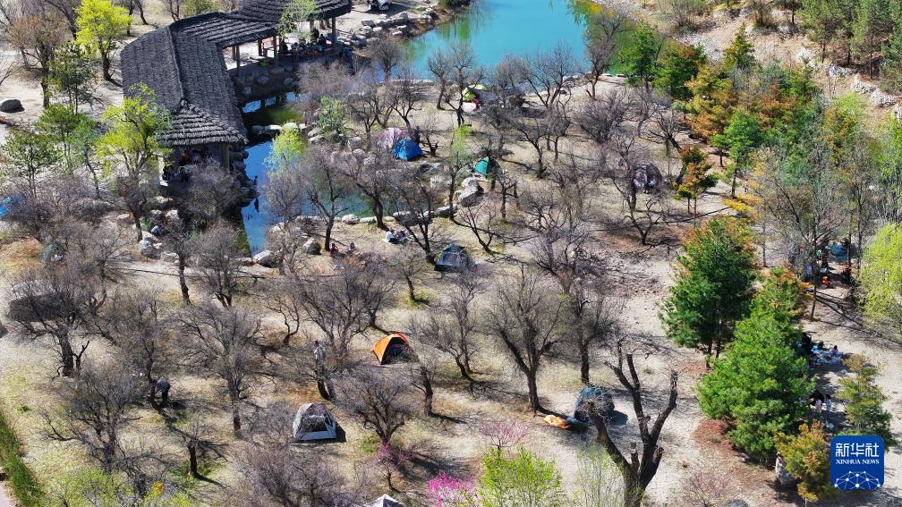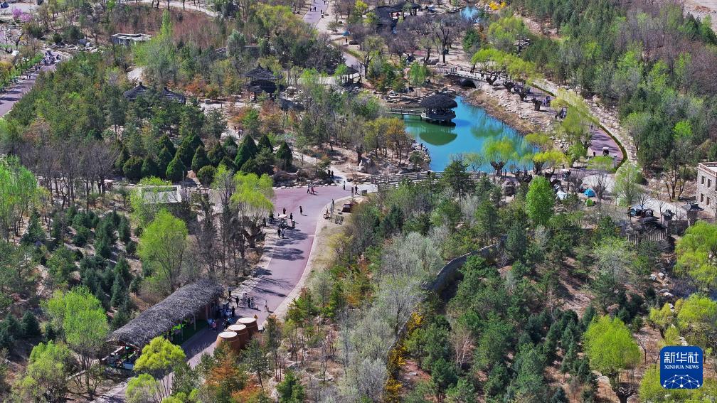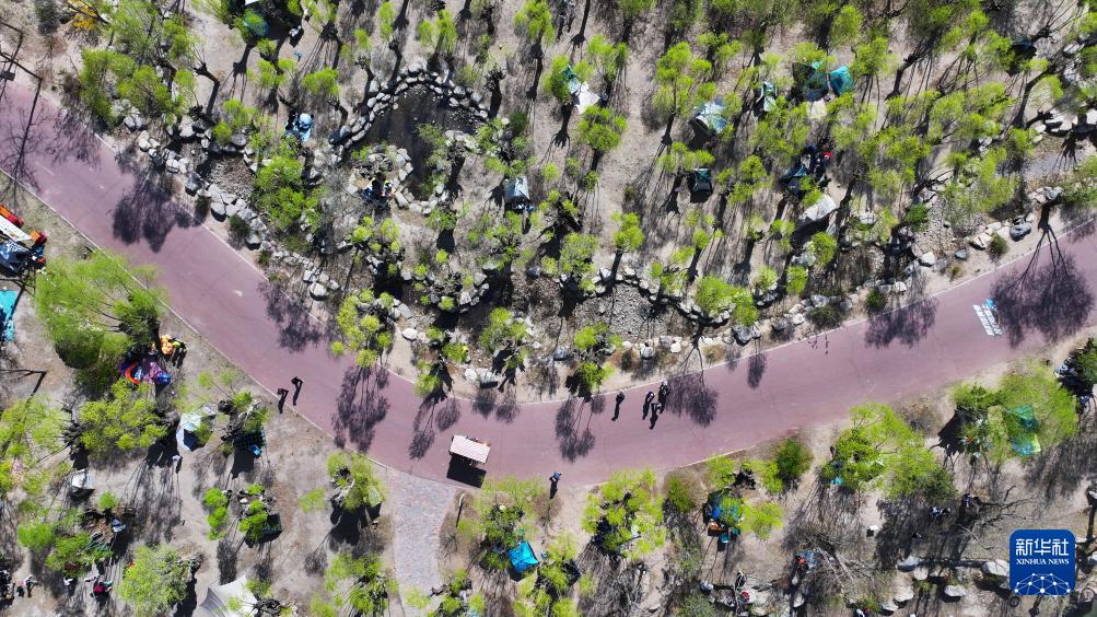 4月10日,市民在贺兰山运动公园游玩(无人机照片)。(新华社记者 王鹏 摄)