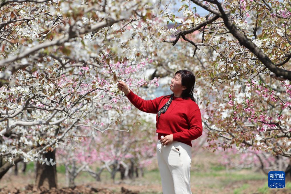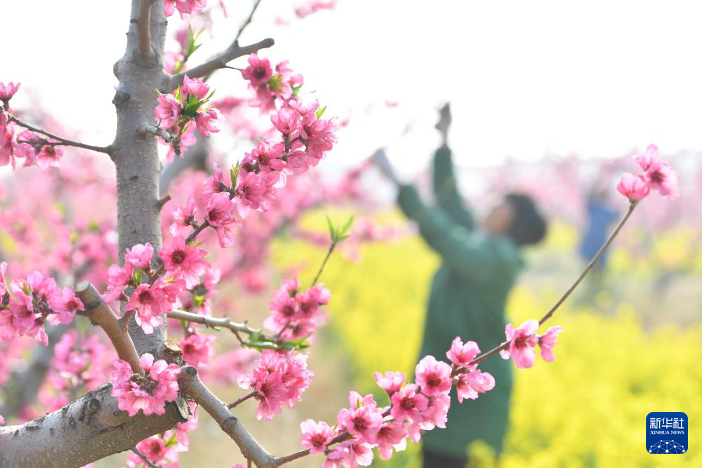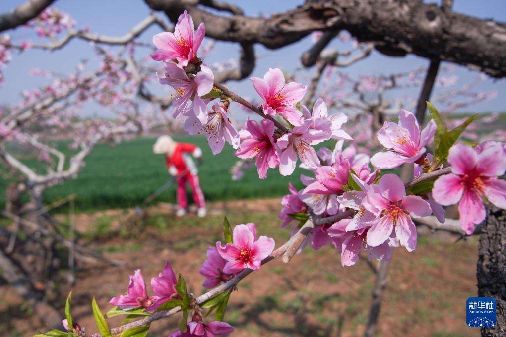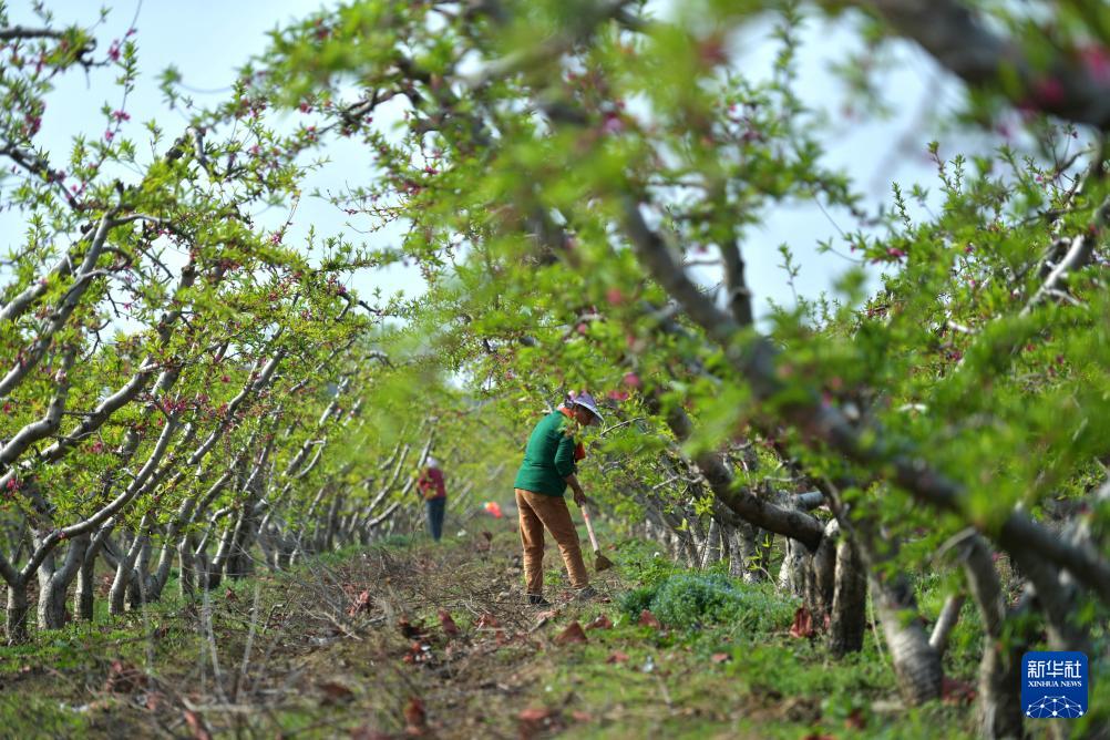 4月11日,河北省遵化市平安城镇夏家峪村农民在桃树园劳作。(新华社发 刘满仓 摄)