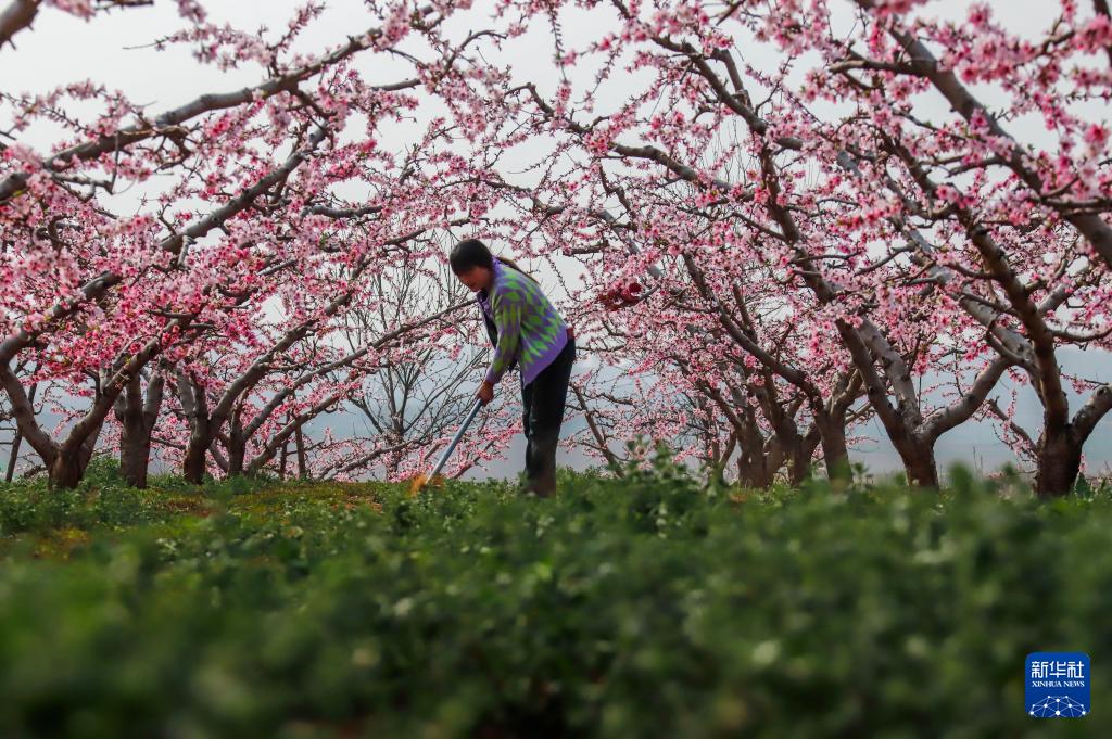 4月11日,村民在河南省夏邑县郭店镇王刘庄村桃园里劳作。(新华社发 苗育才 摄)