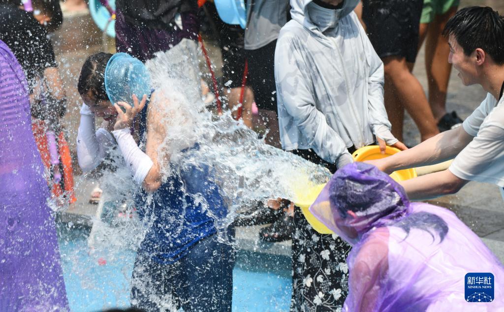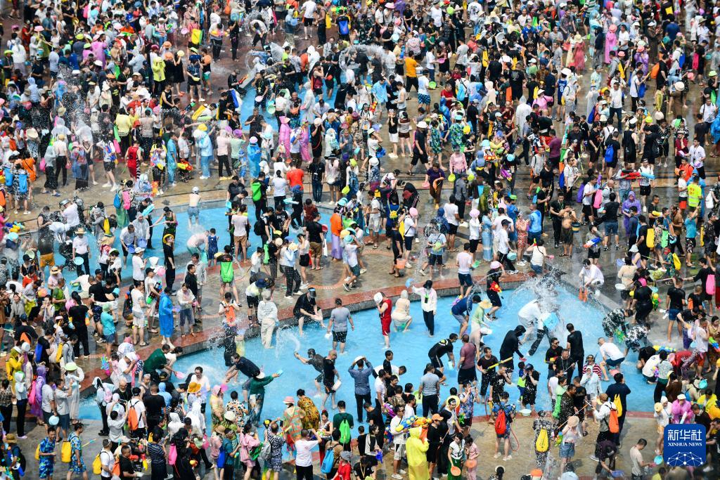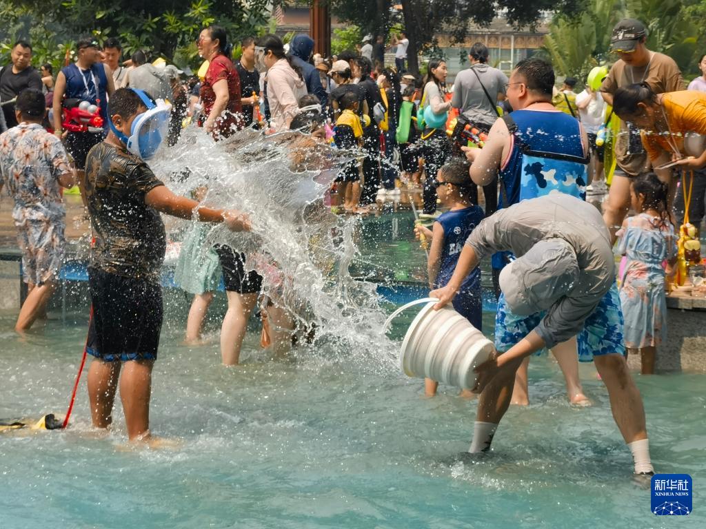 4月15日,云南省西双版纳傣族自治州举行泼水狂欢活动,人们欢聚在景洪市泼水广场,用相互泼水的方式互送祝福,庆祝泼水节。