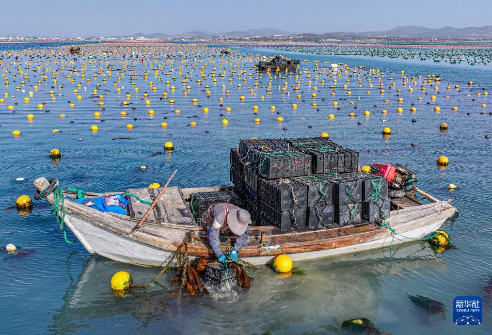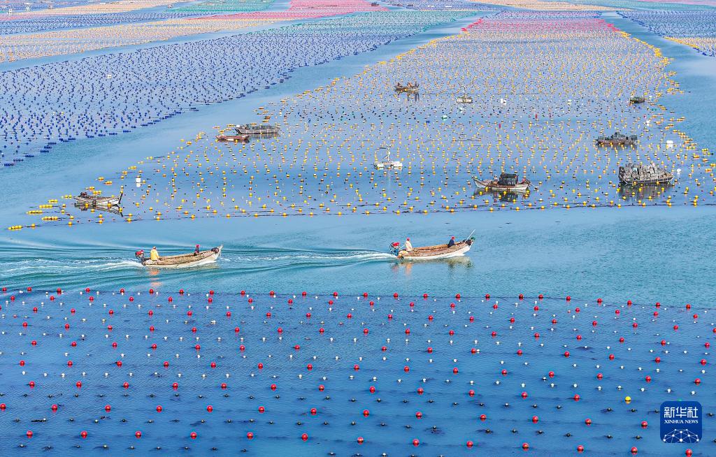 4月16日,在山东省荣成市爱伦湾海域养殖区,养殖工人投放鲍鱼,继续养殖(无人机照片)。(新华社发 李信君 摄)