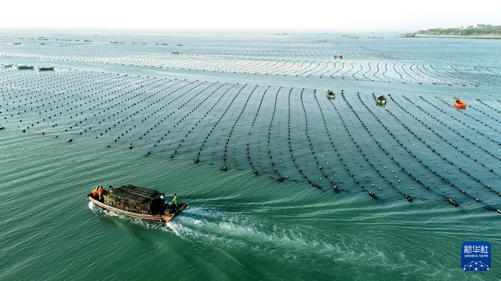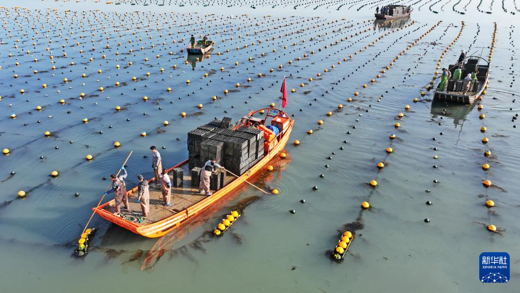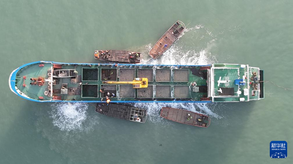 4月16日,在山东省荣成市爱伦湾海洋牧场,养殖工人卸载鲍鱼苗,继续养殖(无人机照片)。(新华社发 杨志礼 摄)