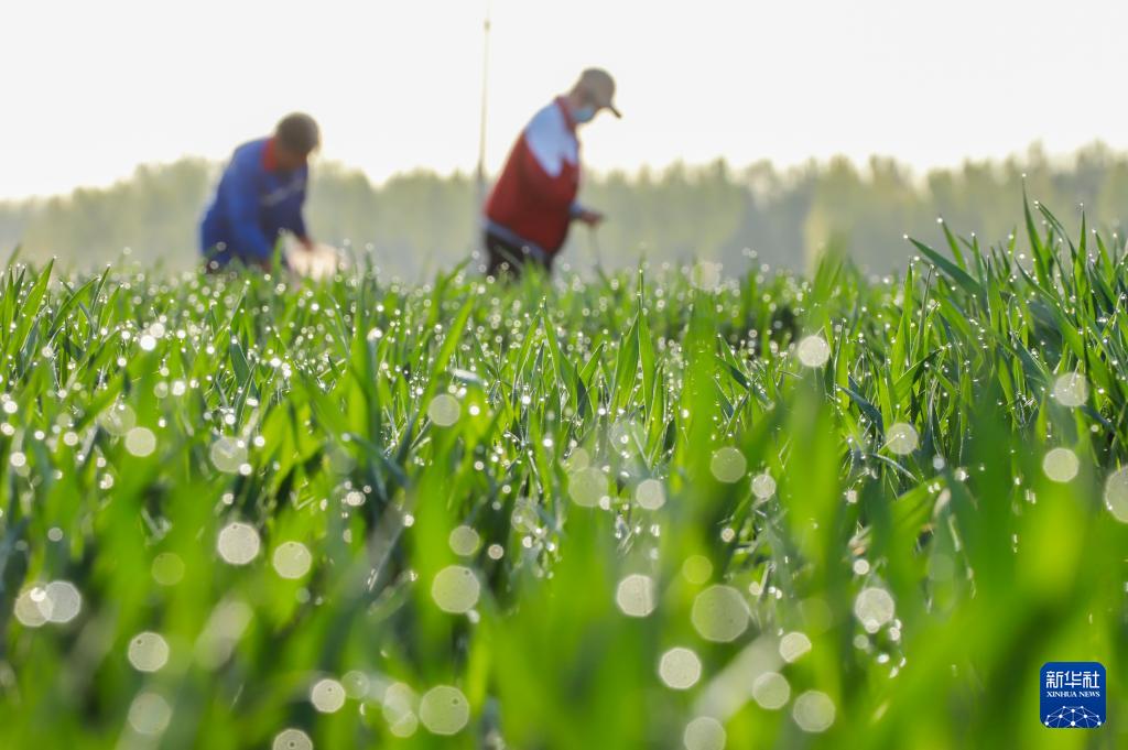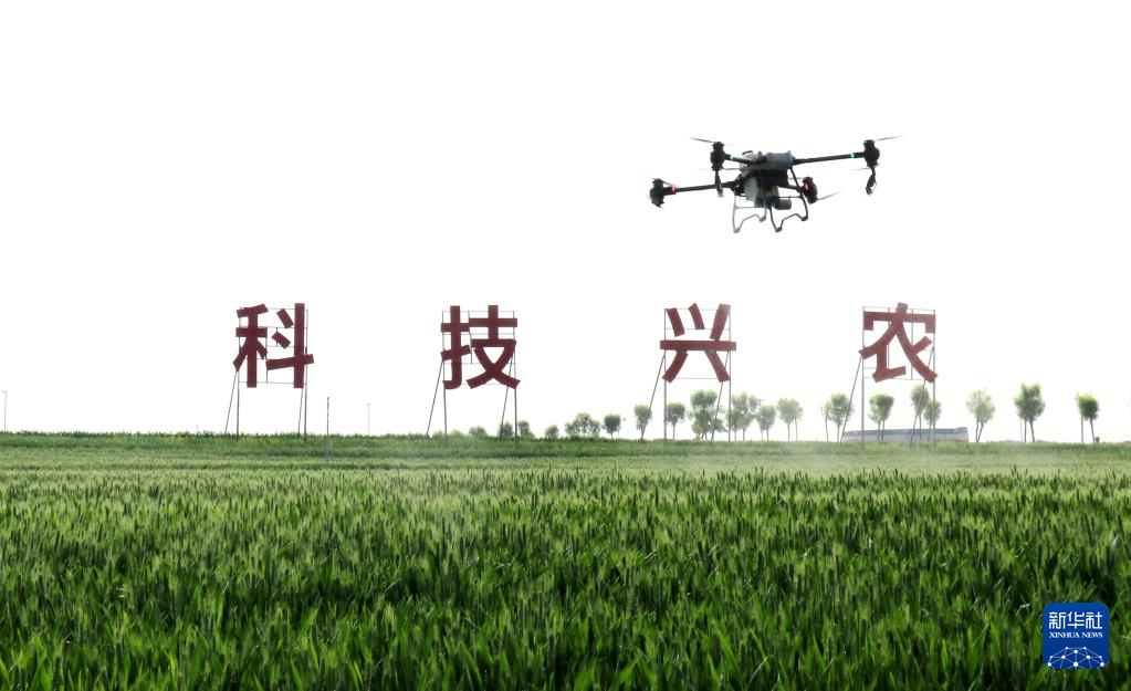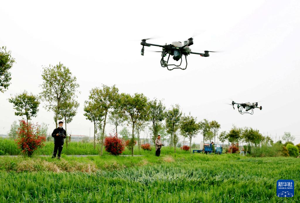 4月17日,在江苏省扬州市江都区宜陵镇大陈村,农民操作植保无人机给小麦喷洒农药。(新华社发 任飞 摄)