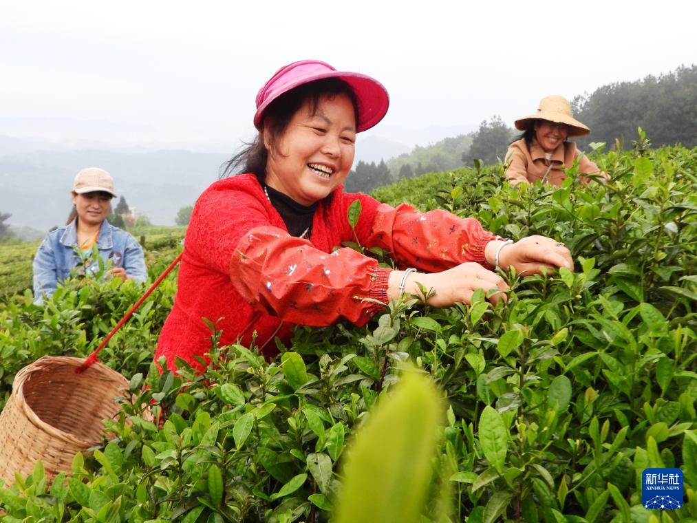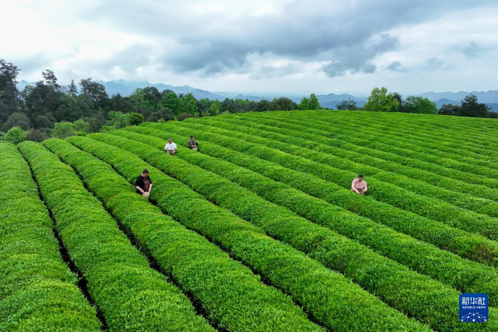 4月17日,在四川省达州市渠县临巴镇凉桥村秀岭春天茶园,茶农采摘富硒有机茶。(新华社发 邓良奎 摄)