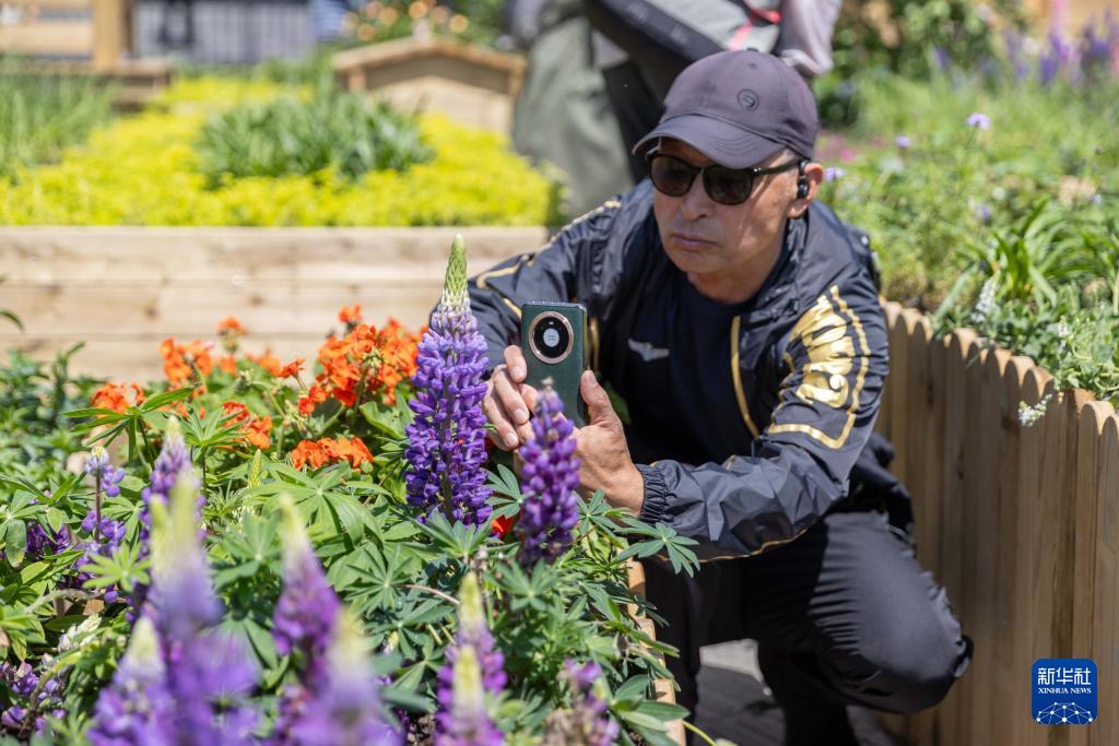 4月18日,人们在徐汇滨江主会场一处花卉景观前拍照留影。(新华社记者 王翔 摄)