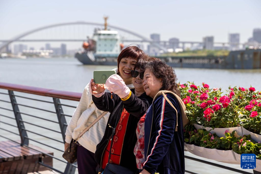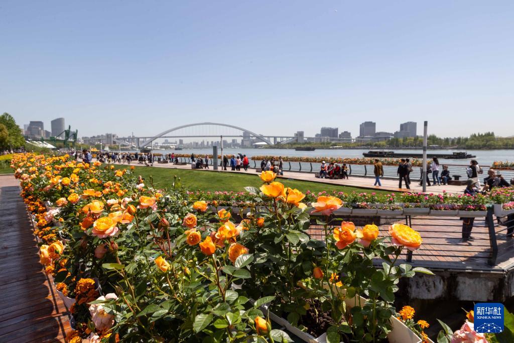 4月18日,人们在徐汇滨江主会场滨江沿线花卉景观前拍照留影。(新华社记者 王翔 摄)
