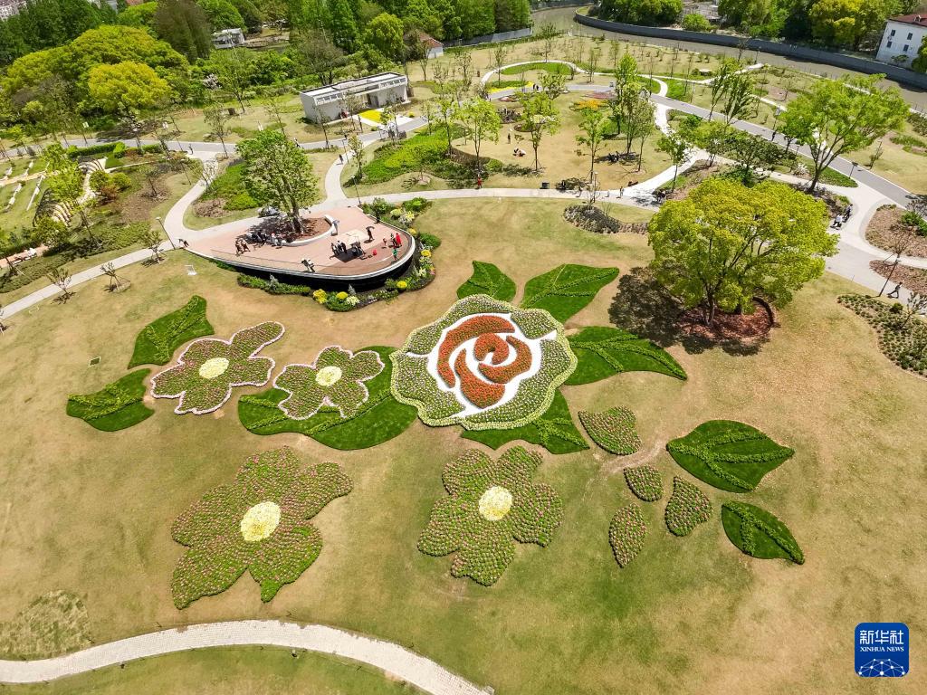 4月18日在上海植物园主会场拍摄的月季花坛(无人机照片)。(新华社记者 王翔 摄)