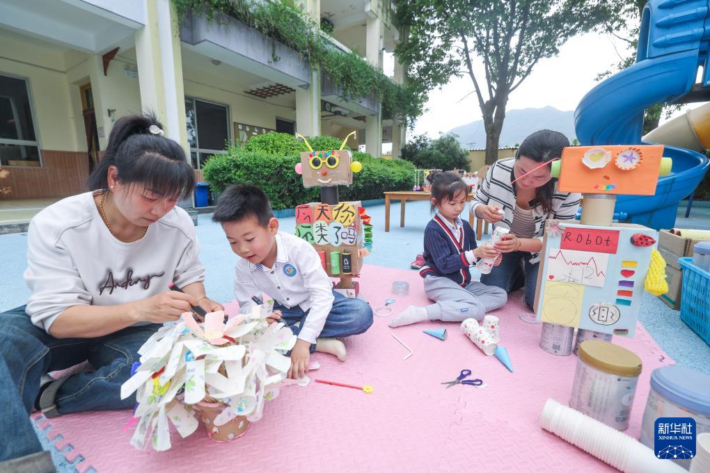 4月19日,孩子们在家长的带领下用废旧纸盒、金属罐、报纸等制作玩具模型,用来装饰校园。(新华社记者 徐昱 摄)