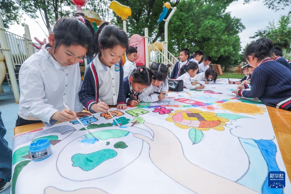 4月19日,孩子们在绘制世界地球日的环保主题长卷。(新华社记者 徐昱 摄)