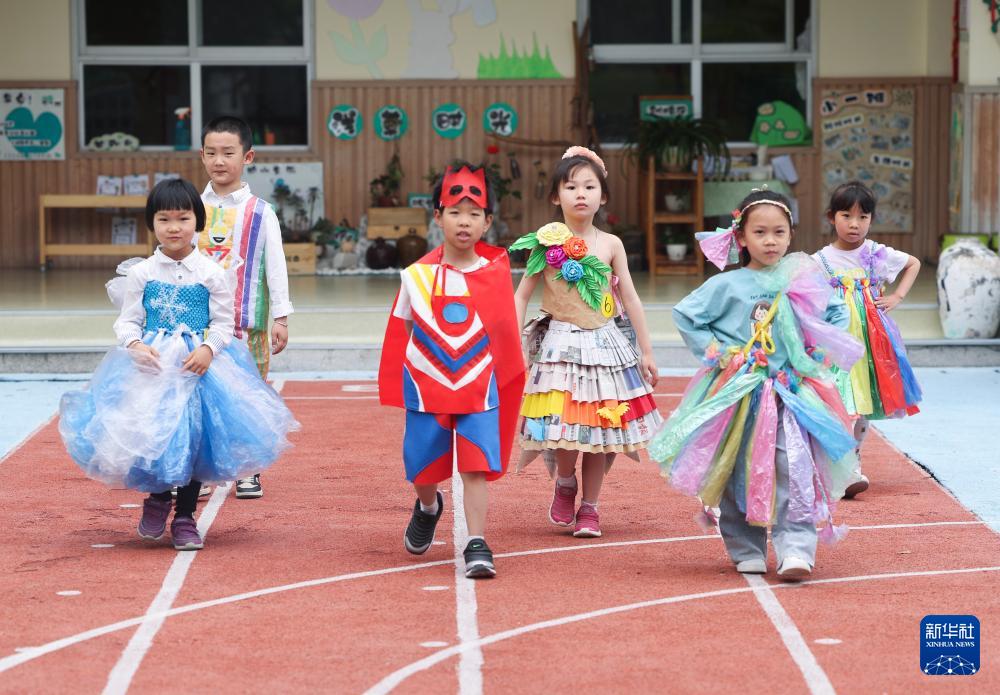 4月19日,浙江省诸暨市赵家镇中心幼儿园开展校园主题环保活动,迎接即将到来的第55个世界地球日。孩子们在老师和家长的带领下,参加环保主题长卷绘制、用废旧物品制作玩具模型、展示环保时装等活动,让保护地球生态环境成为每个孩子的自觉行动。