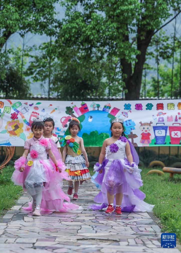 4月19日,孩子们身穿用废旧纸板、塑料袋等材料制作的时装,参加校园环保时装秀。(新华社记者 徐昱 摄)