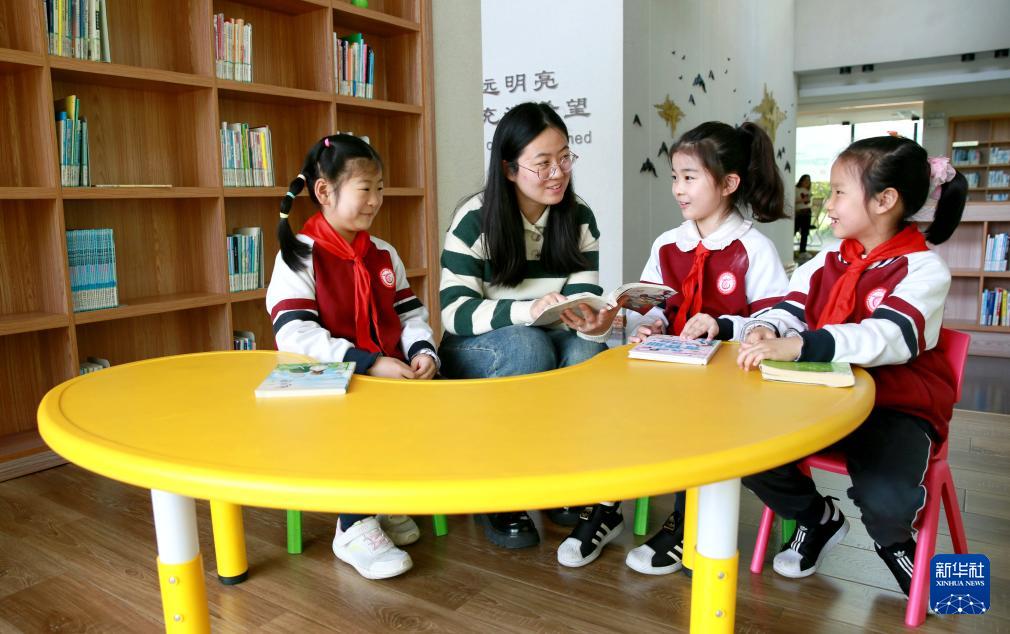 4月22日,江苏省扬州市江都区实验小学师生在若虚城市书房交流阅读心得。(新华社发 任飞 摄)