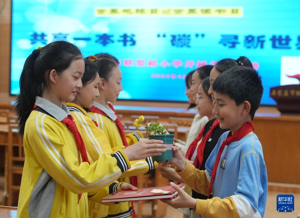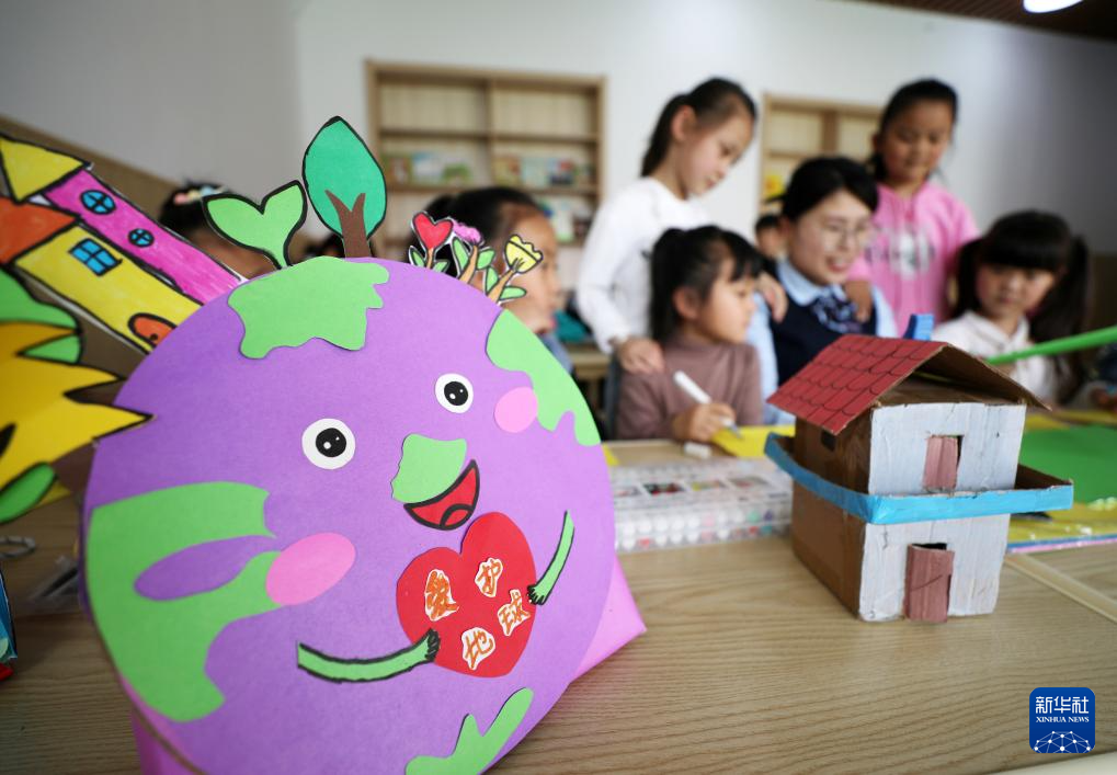 4月22日,小学生在河北省石家庄市联盟路小学参加爱护地球公益活动。(新华社发 闫志国 摄)