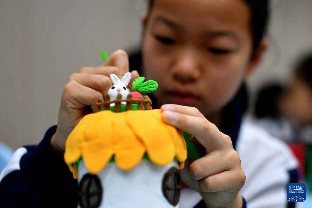 4月22日,在山东省青岛市市北区嘉定路小学,一名学生利用废旧材料制作“生态小屋”。(新华社发 王海滨 摄)
