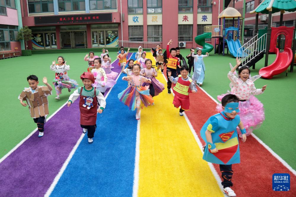 4月22日,在山东省枣庄市市中区一幼儿园,小朋友们身穿用塑料袋、纸箱等废旧物品制作的环保服装进行展示。(新华社发 王海楠 摄)